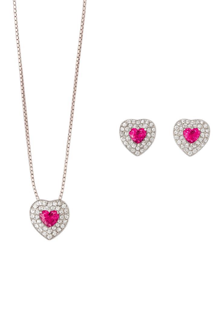 Conjunto Coração Rosa Pink Cravejado Lyra - Banhado Á Ródio Branco