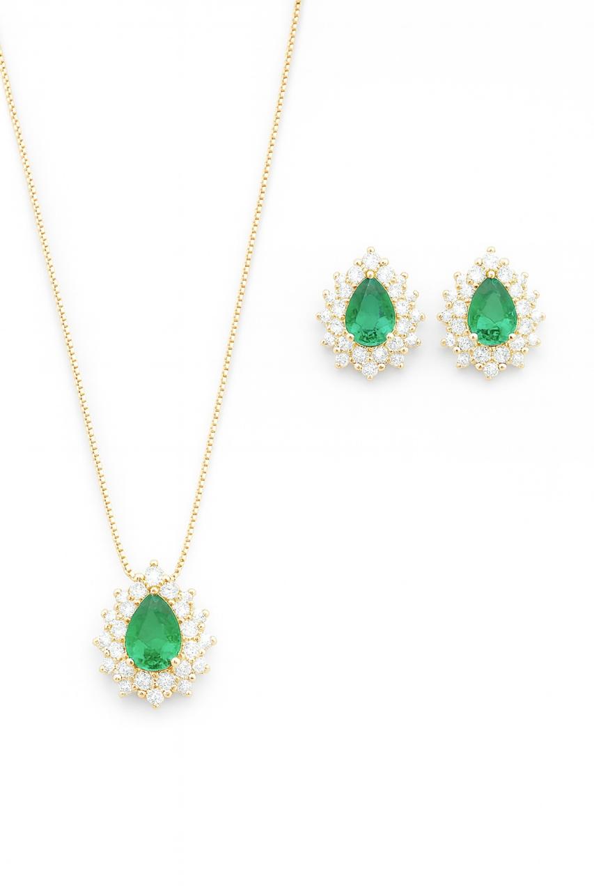 Conjunto Gota Verde Esmeralda Elissa - Banhado no Ouro18k